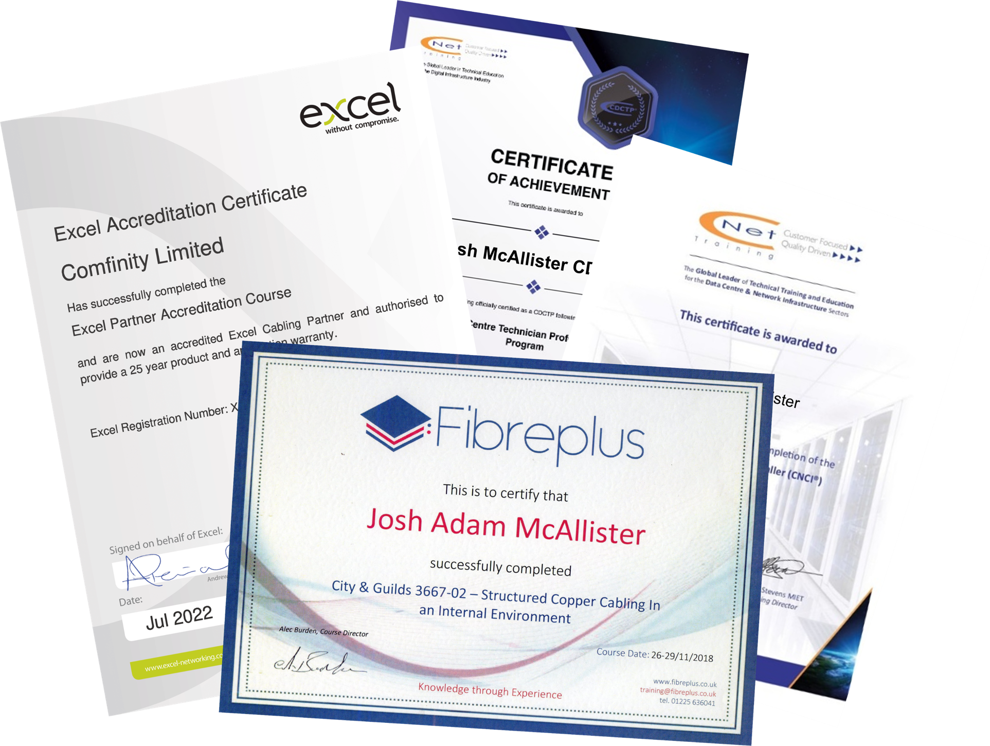 At Comfinity, we are proud to be an approved installer of the UK’s leading data cabling brand and manufacturer Excel. Having passed the training course consequently over a number of years, we are able to offer a full manufacturer 25-year warranty on all copper and fibre optic cabling installations.